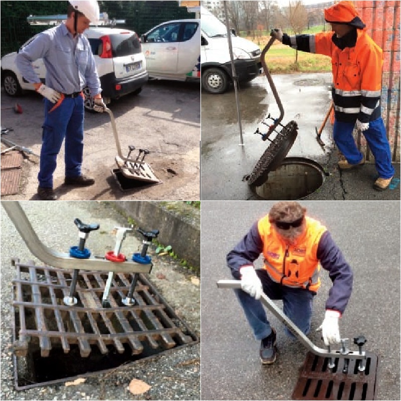 Praktický a všestranný nástroj určený pro otvírání a přemísťování většiny kanálů, poklopů a mříží, které mají otvory nebo dutiny umožňující zachycení hákem. Páka je vyrobena z nerezové oceli čtvercového profilu, se dvěma bočně nastavitelnými šrouby a centrálním šroubem s hákovým terminálem, který může být zasunut do otvorů, aby vytvořil pevnou podporu pro zvedání. Nástroj je všestranný, může být použit více způsoby.